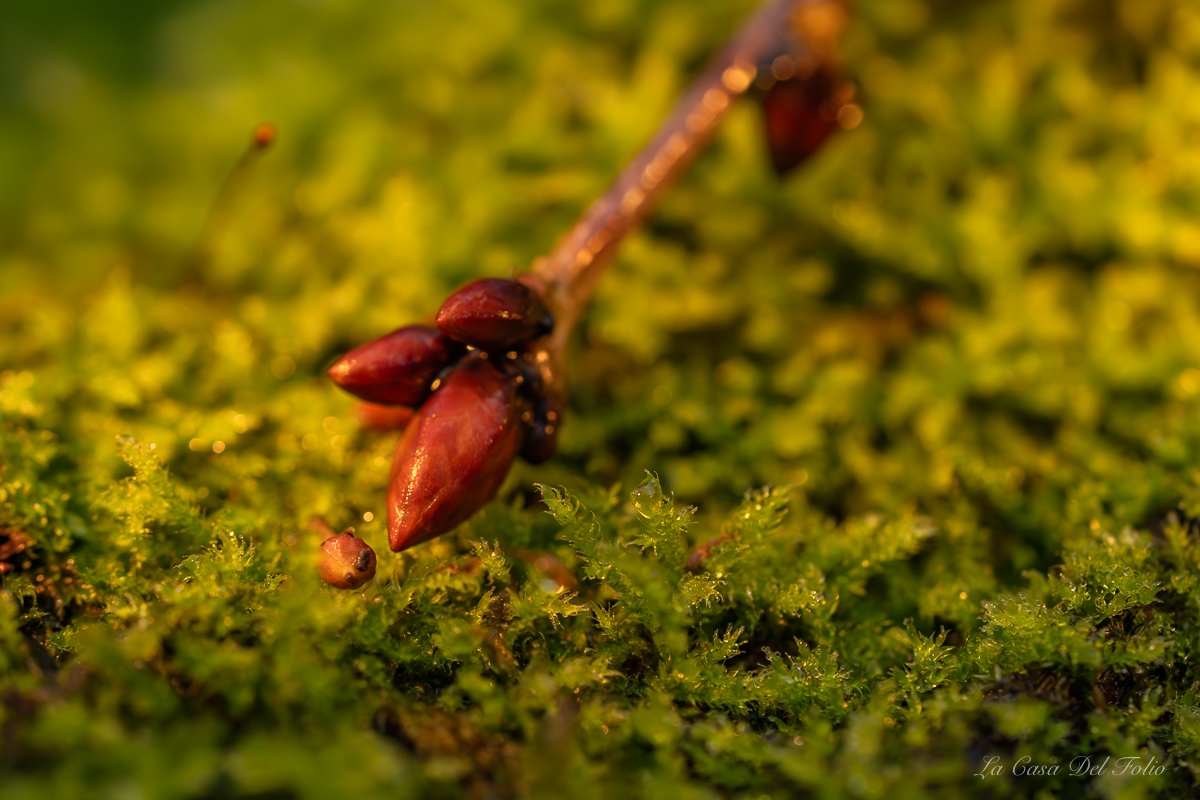 Photographie macro d’un bourgeon brun posé sur de la mousse verte