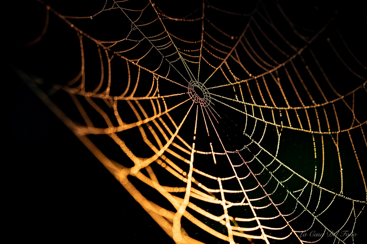 Photographie macro d’une toile d’araignée éclairée par une lumière dorée